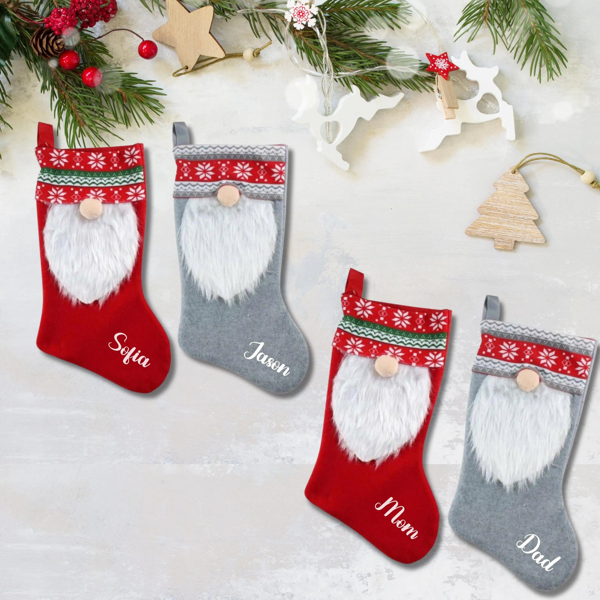 Bring festive charm to your holiday mantel with this delightful personalized gnome Christmas stocking. Crafted in classic red and gray tones, this whimsical design captures the cozy spirit of the season while adding a unique touch to your family's traditions. Perfect for displaying names or initials, it becomes a cherished keepsake year after year. Whether you're stocking it with small gifts or hanging it as a decorative accent, this gnome stocking transforms your home into a winter wonderland. Make this Christmas season unforgettable with a personalized piece that celebrates both festive joy and individual character.
