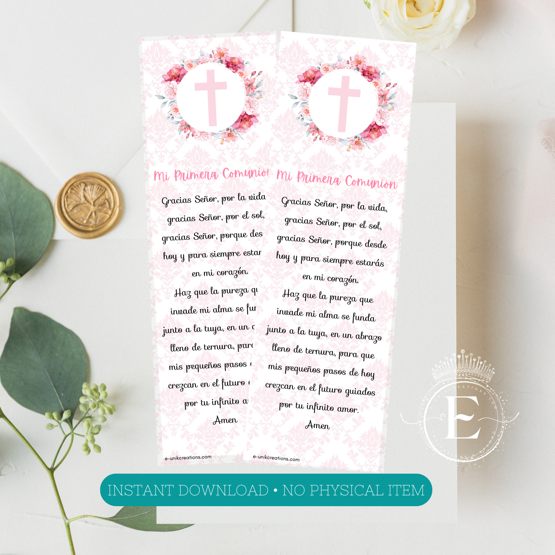 Girl Pink First Communion Bookmark Prayer-Spanish-Instant Download PDF