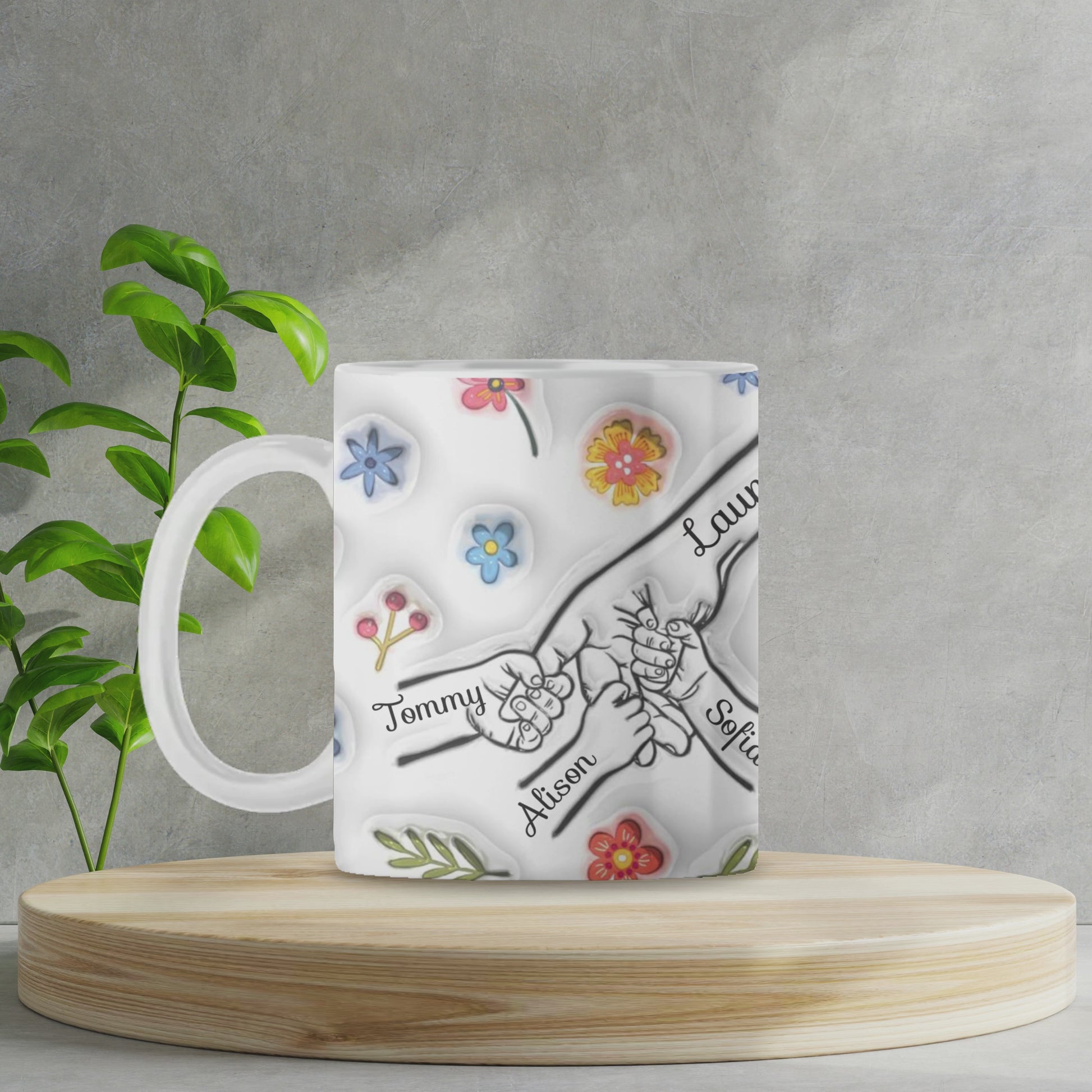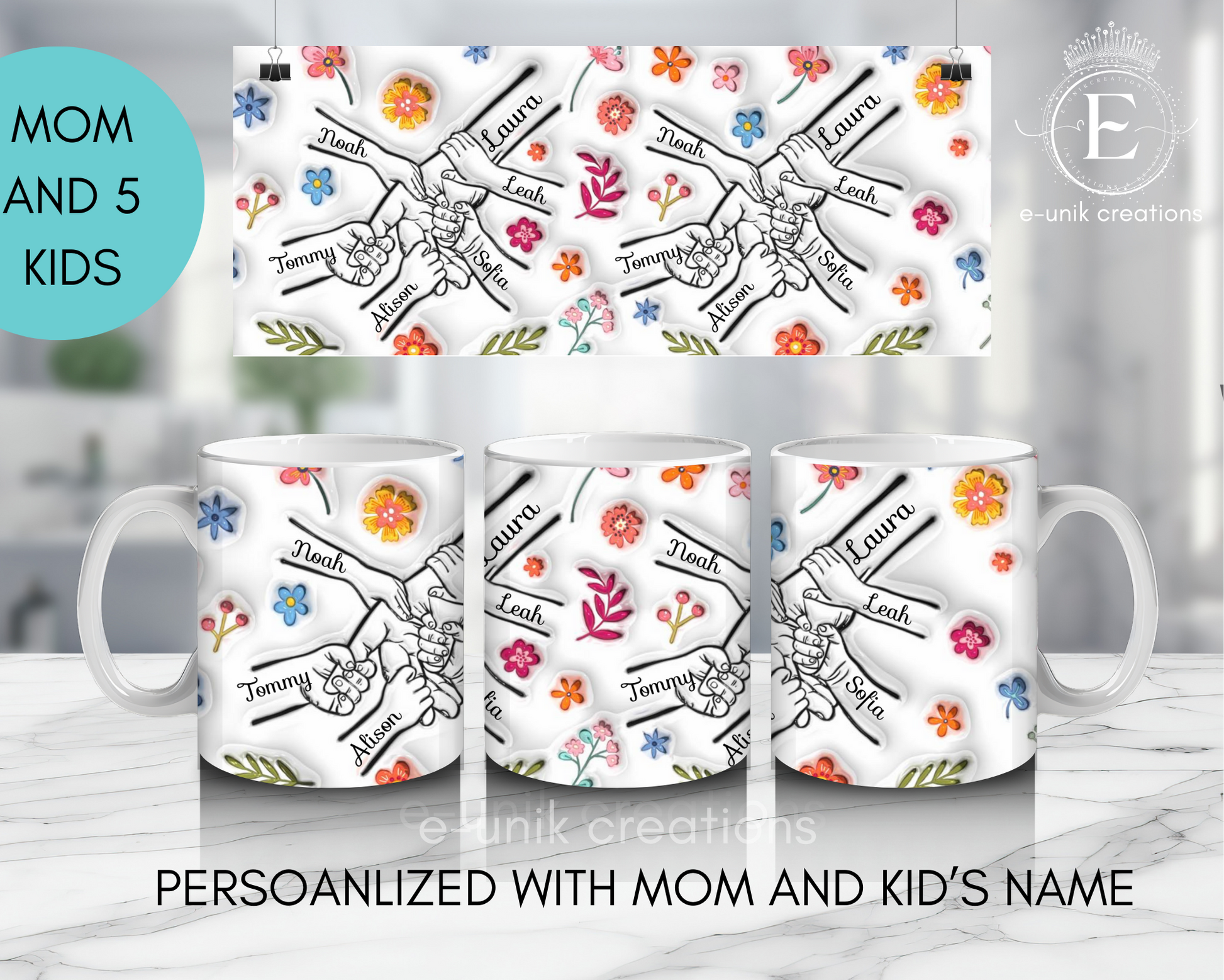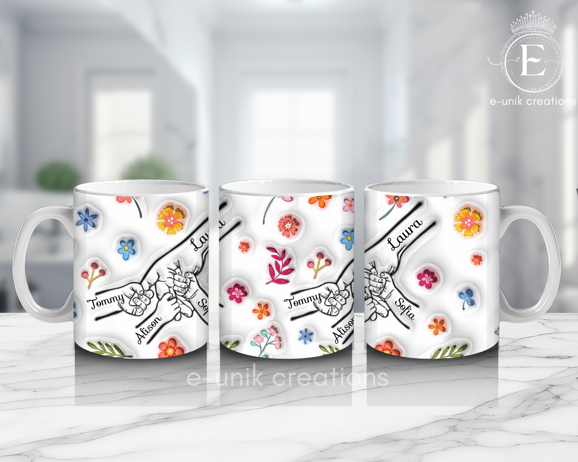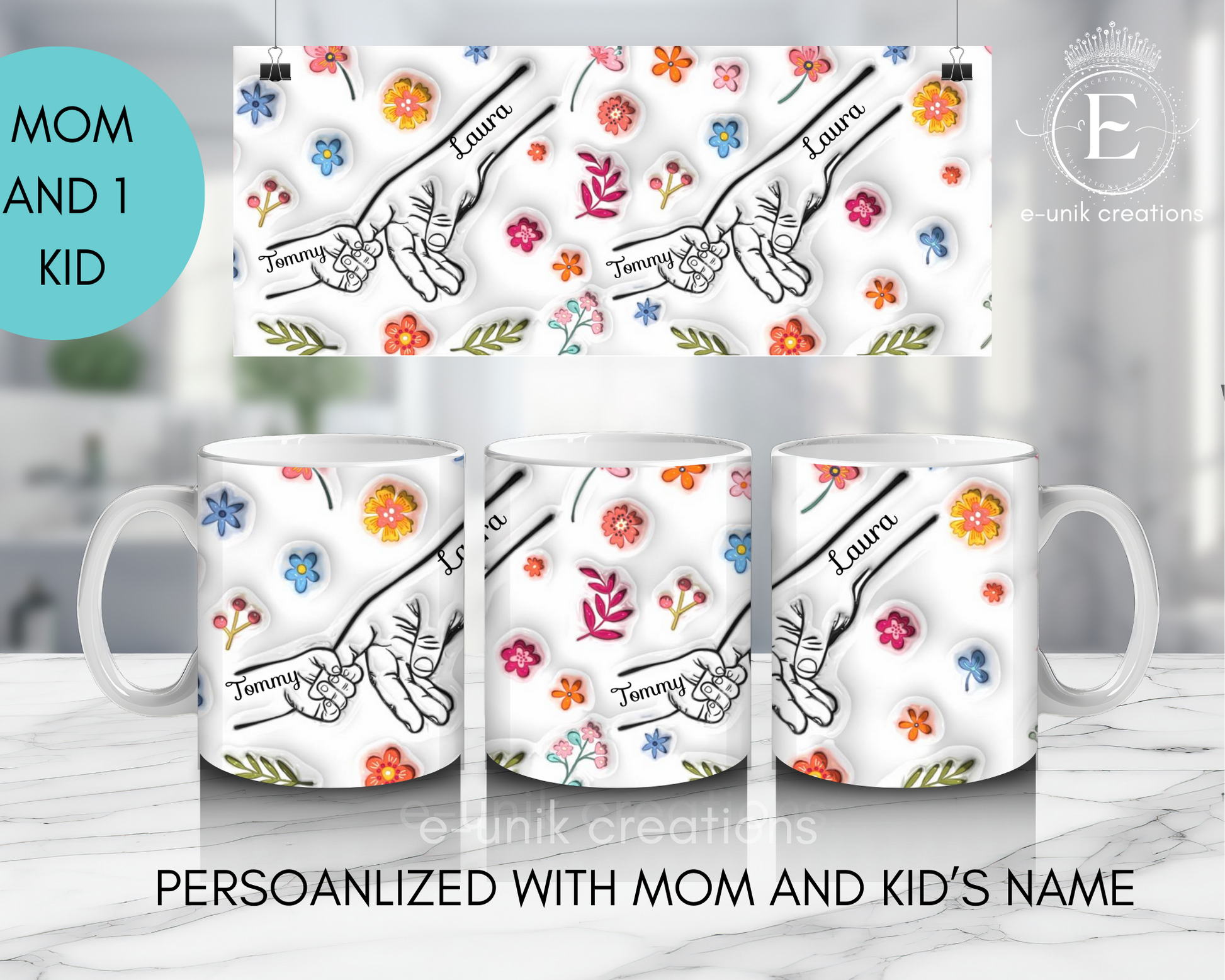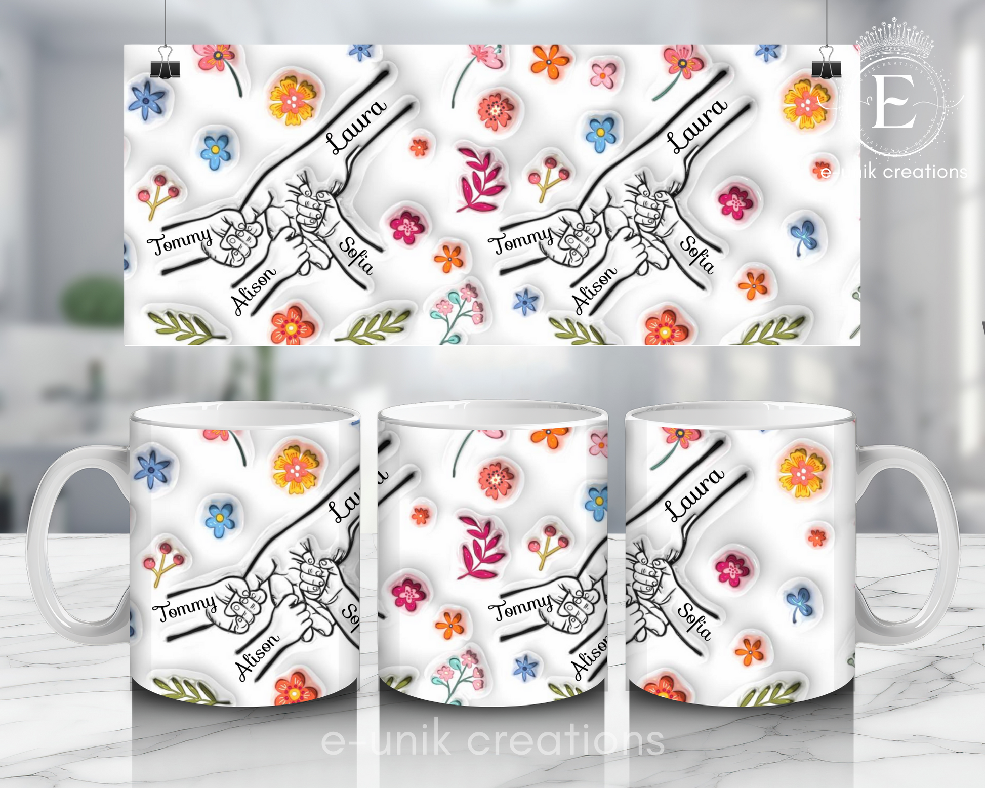 Wow your loved ones with our Mom and Kid's Name 3D Floral Mug! This 11 oz white mug features a personalized 3D floral design with mom and child's names. Perfect for sipping your favorite beverage and showing off your special bond. Order now and make your loved ones feel extra special!