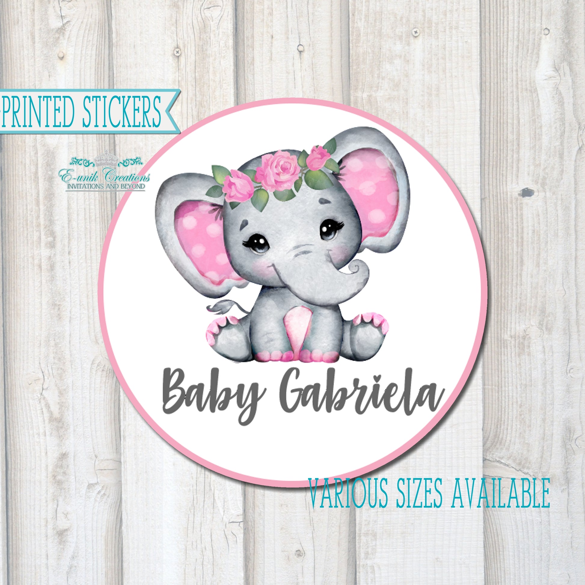 Personalized round labels/stickers are the perfect addition for any party. These adorable elephant girl theme will add a personal touch to your occasion.