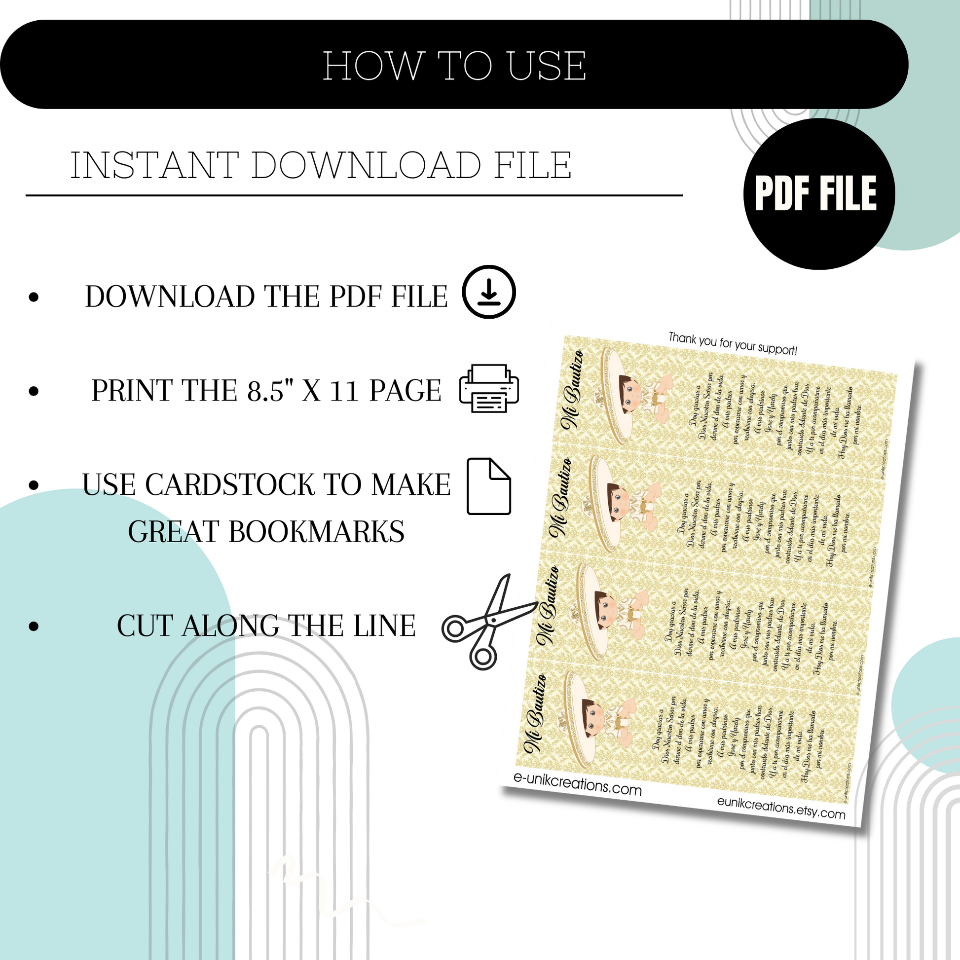 Upon purchase, you will receive a digital PDF file ready for printing. Simply download, print as many copies as needed, and trim along the designated lines for the perfect-sized bookmark favor.
