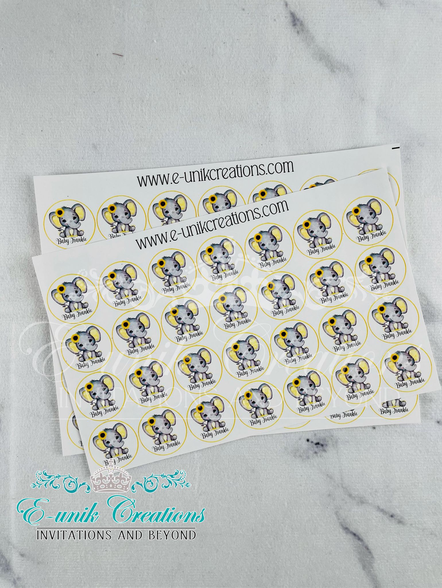 Personalized round labels/stickers are the perfect addition for any party. These sunflower elephant theme will add a personal touch to your occasion. -
